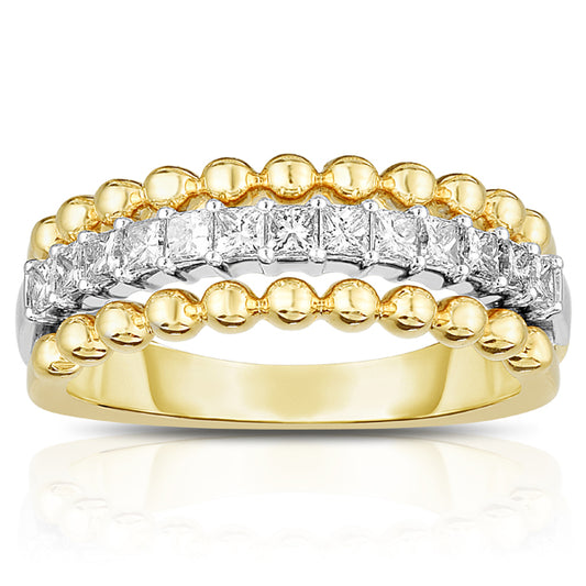 3 Row Band with Prong Princess Cut Diamond Center and Beaded Edges
