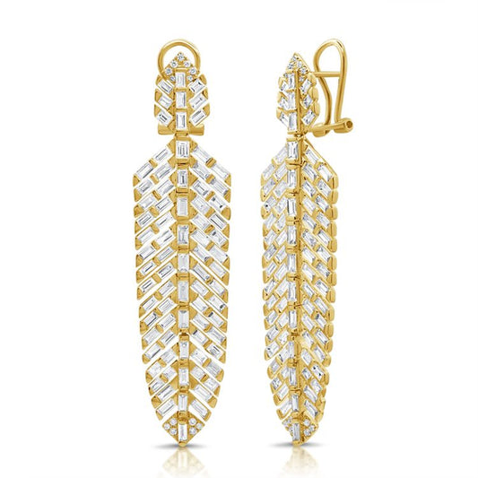 Long Feather Drop Earrings with Pave Diamonds and Bar Set Baguette Cut Diamonds