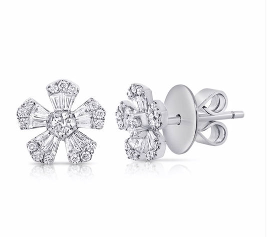 Round and Baguette Diamond Flower Studs in Yellow Gold