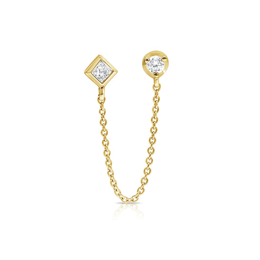 Single Double-Stud Earring with Chain Connection with Princess and Round Cut