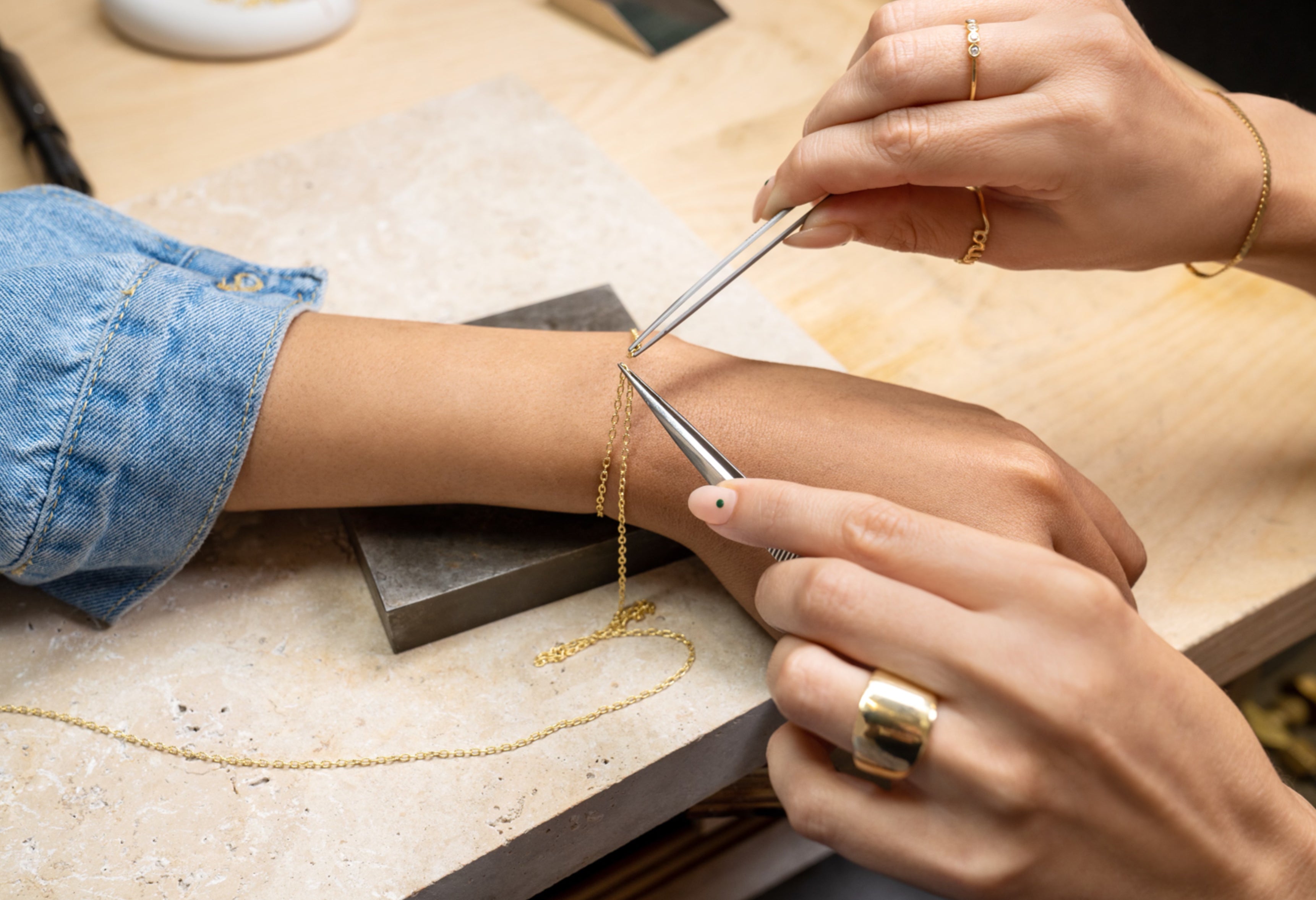 All of our MJ Endless bracelets are 14k yellow gold, so you won't have to worry about it tarnishing when getting wet.