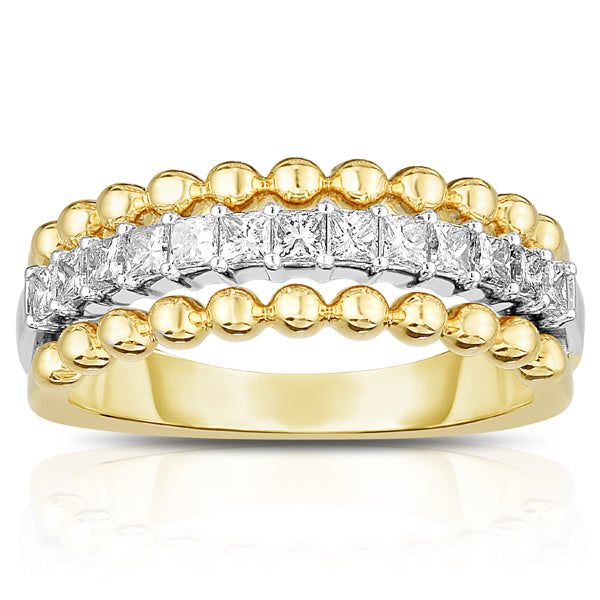 3 Row Band with Prong Princess Cut Diamond Center and Beaded Edges