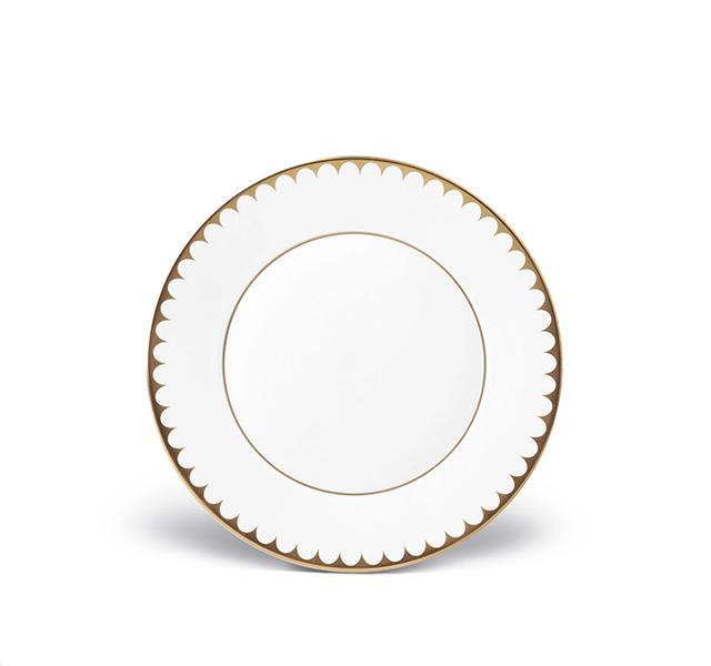 L'Objet Aegean gold filet dessert plate. Mirroring the waves of its namesake sea, Aegean Filet dinnerware features a timeless pattern of scales in a delicately scalloped border, hand-applied in 24k gold.