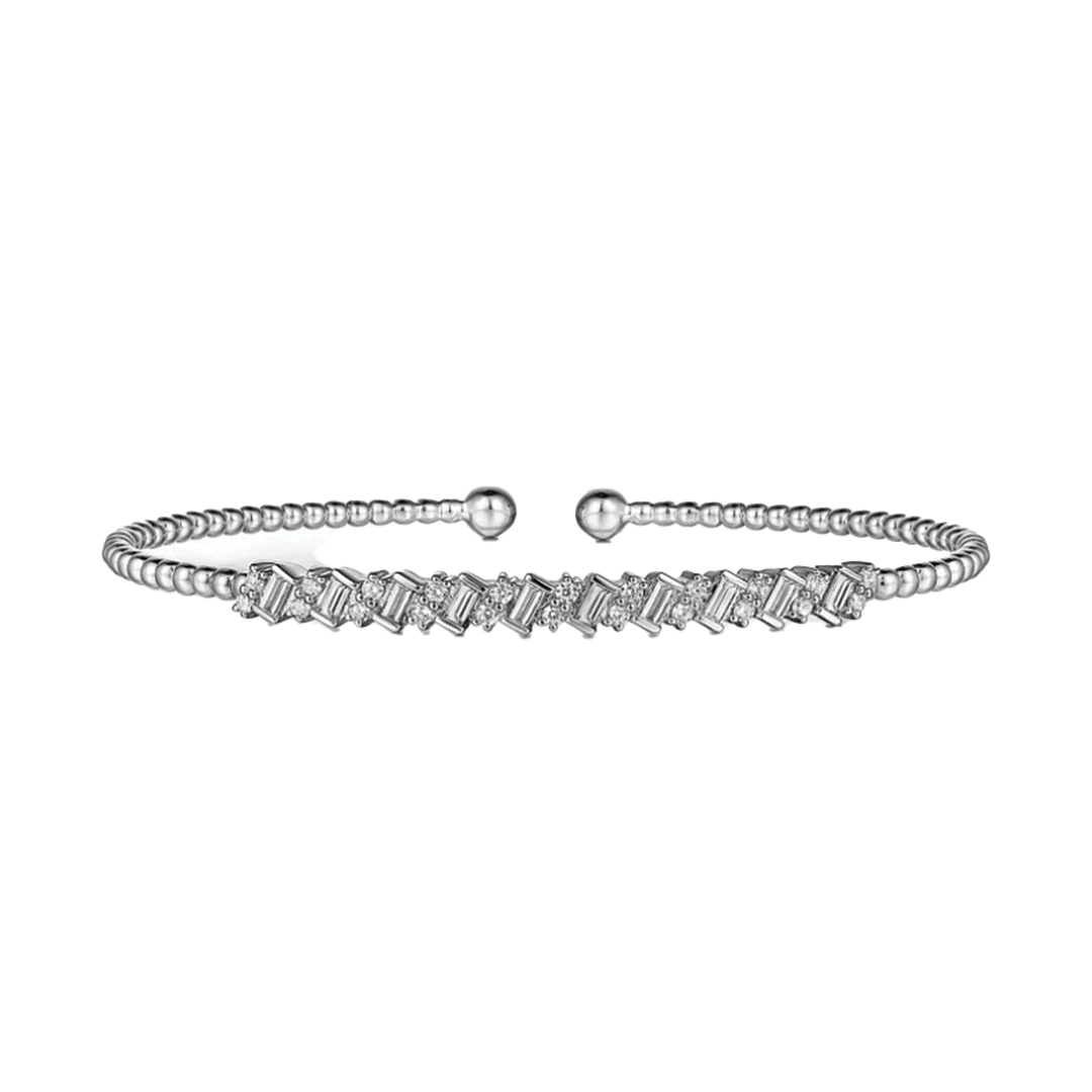 Round and Baguette Diamond Cuff Bracelet in 14K White Gold