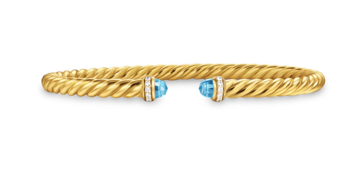 18-karat yellow gold • Blue topaz, Pavé-set diamonds, 0.05 total carat weight • Bracelet, 4mm • Cablespira® is a patented DY construction that is highly flexible and exceptionally comfortable to wear.