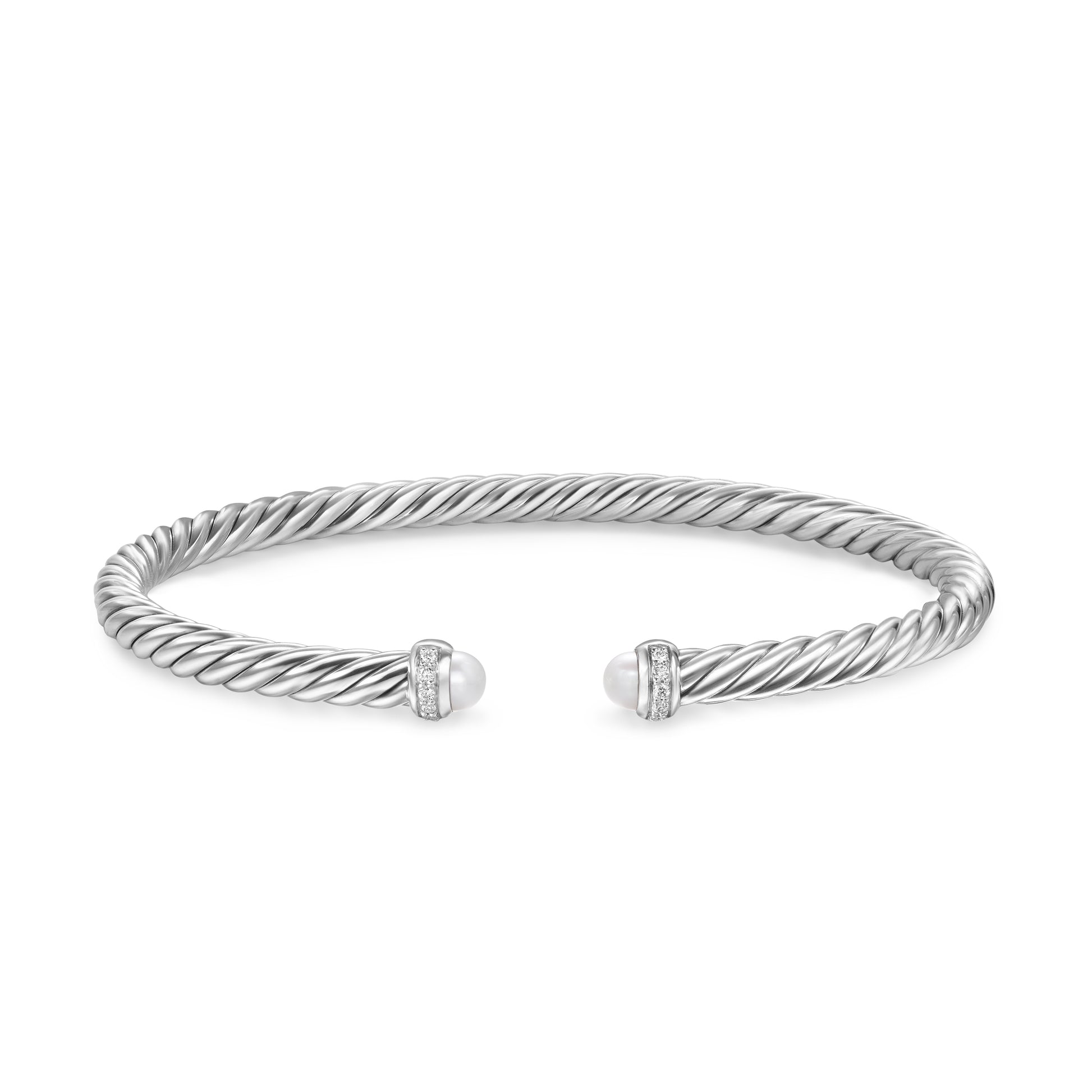 Sterling silver • Cultured freshwater pearls, 4.2mm, Pavé-set diamonds, 0.05 total carat weight • Bracelet, 4mm • Cablespira® is a patented DY construction that is highly flexible and exceptionally comfortable to wear.
