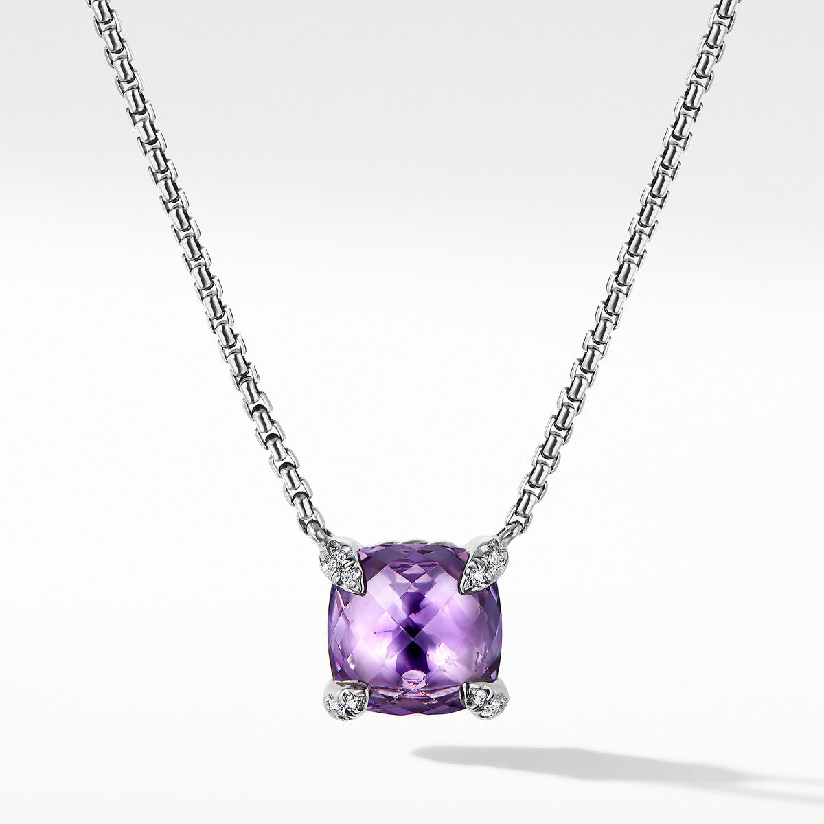 Sterling Silver • Amethyst, Pavé Diamonds, 0.03 total carat weight, • Total length, 18 • Pendant, 8mm • Lobster clasp-