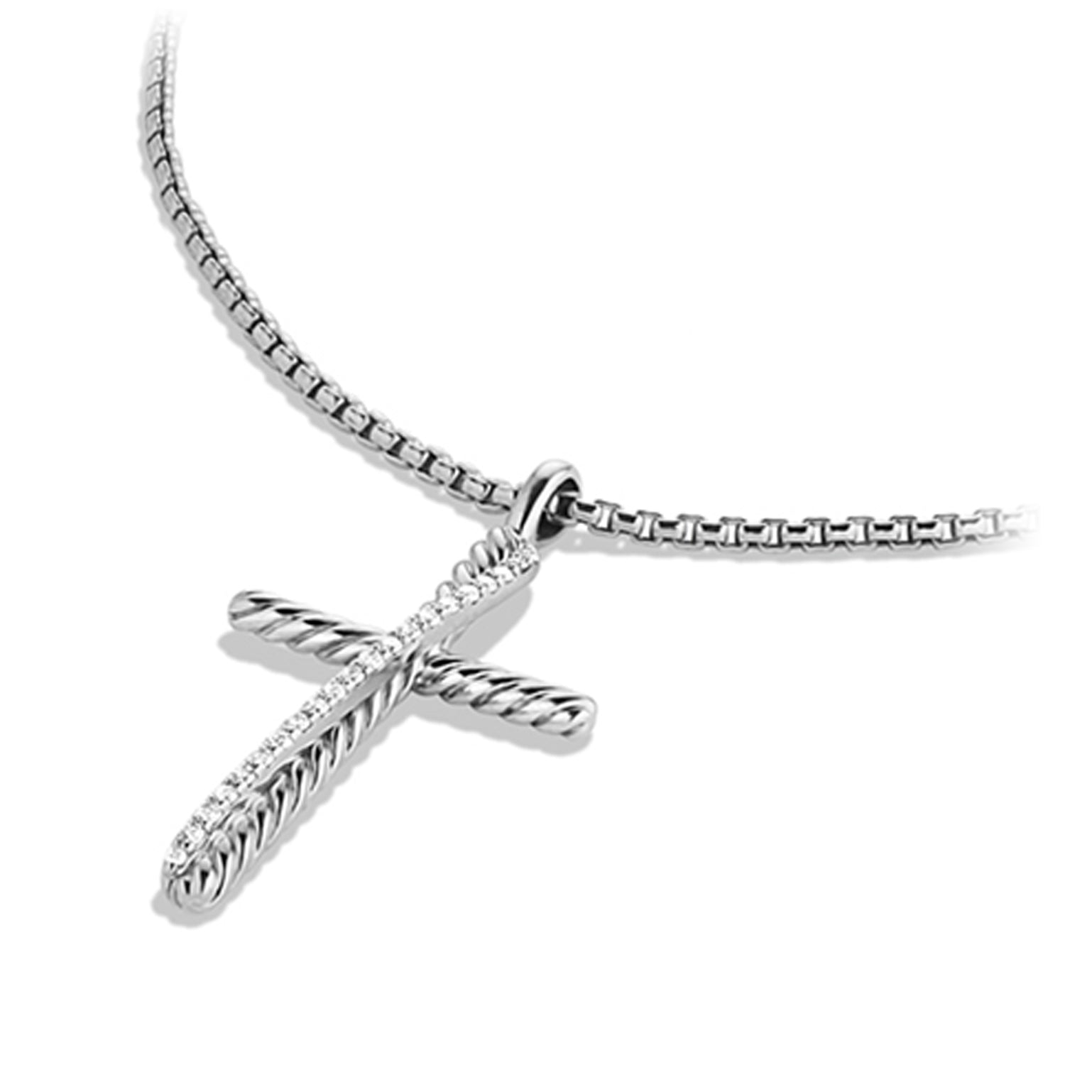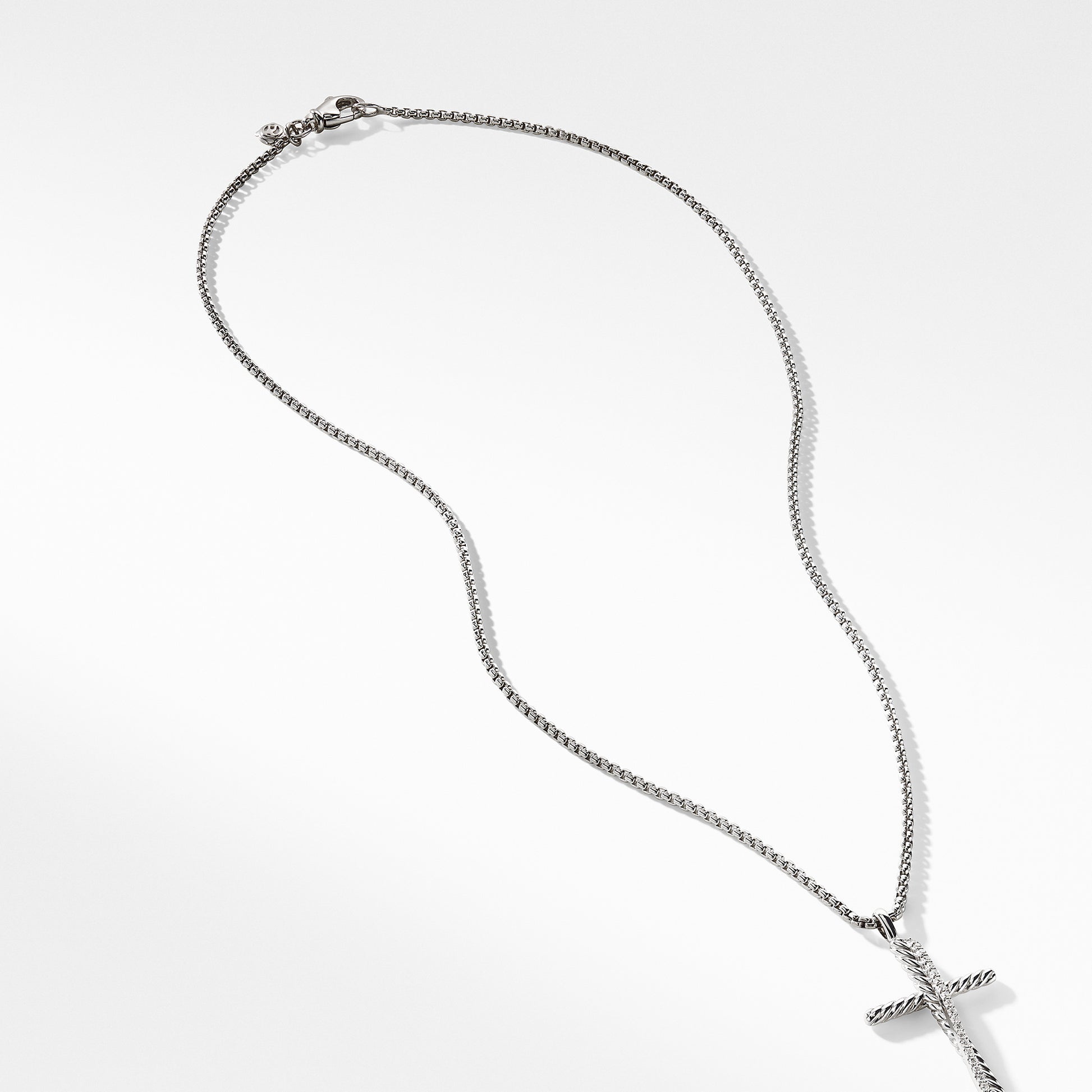 Sterling silver • Pavé diamonds, 0.13 total carat weight, • Baby box chain, 1.7mm wide • Cross, 19.5 X 35.6mm • Lobster clasp-