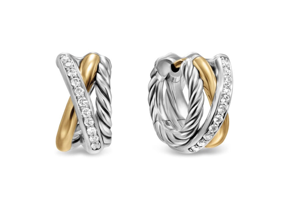 Crossover Three Row Huggie Hoop Earrings in Sterling Silver with 18K Yellow Gold, 13mm