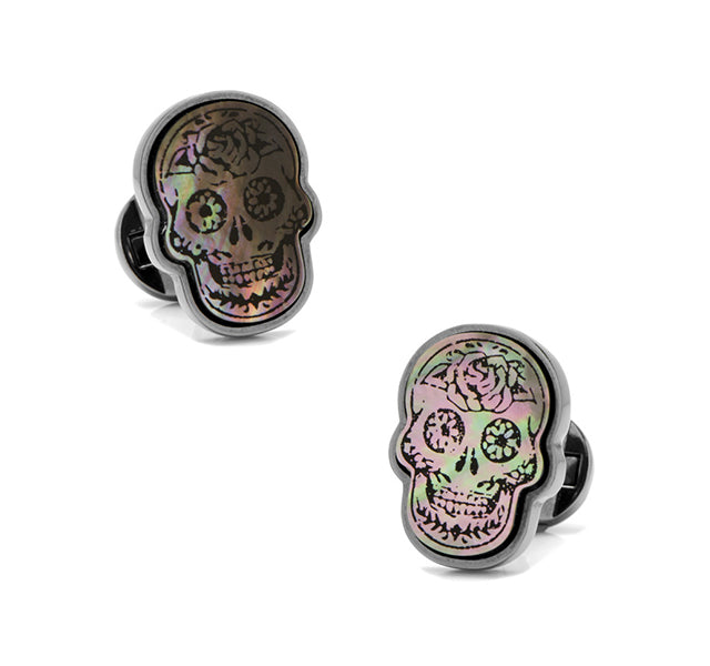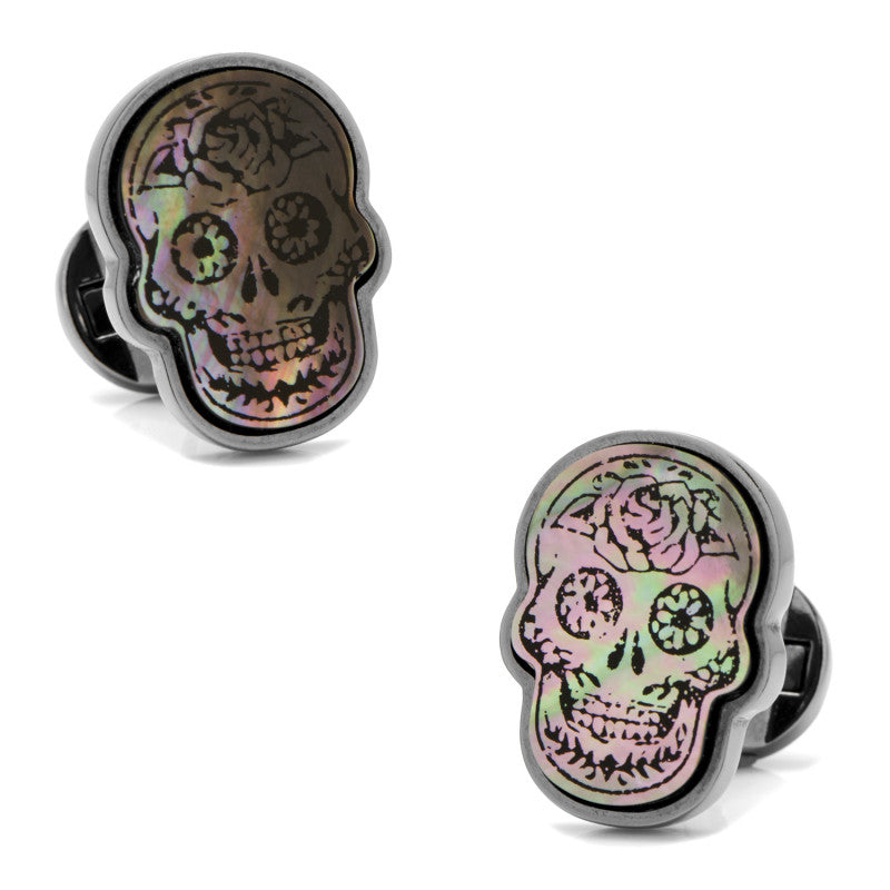 Day of the Dead cufflinks are the perfect fall accessory. Dress up your sleeves with this mother of pearl set. The smoky hues of yellow, green and pink and detailed skull design face will add personality to your style.