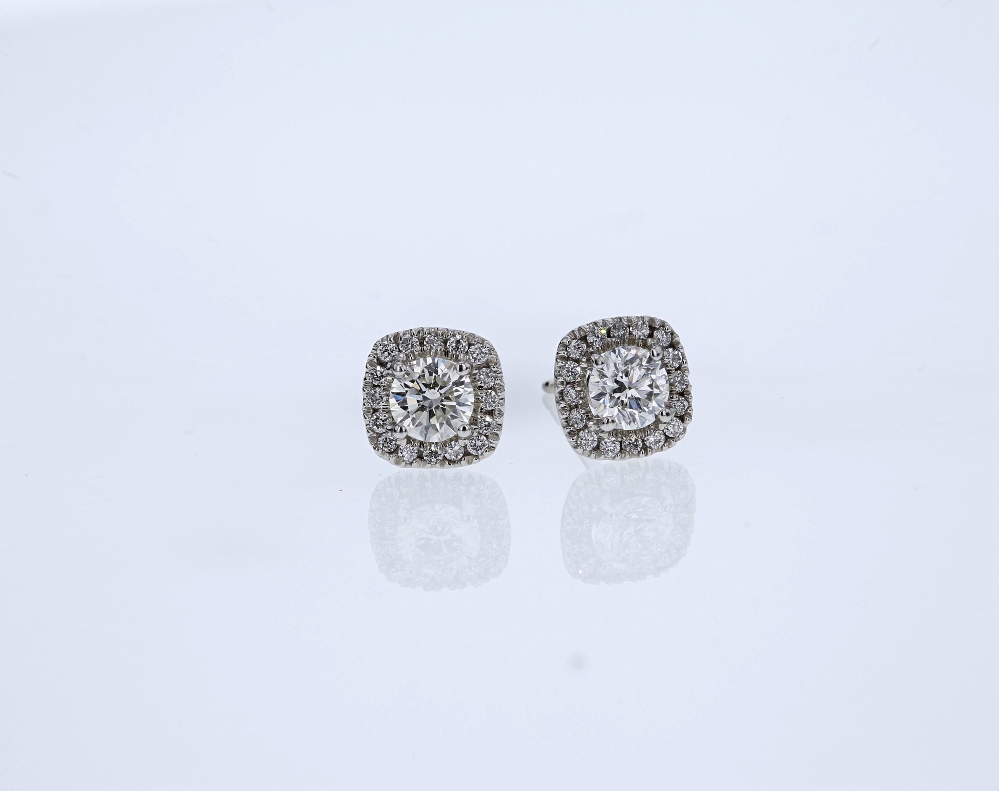Round diamond with cushion shape halo stud earrings in 14k white gold.