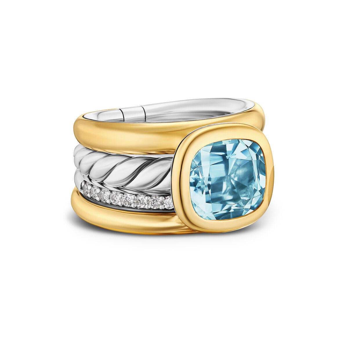 DY Mercer® Four Row Stone Ring in Sterling Silver with 18K Yellow Gold, Sky Blue Topaz and Diamonds, 14mm
