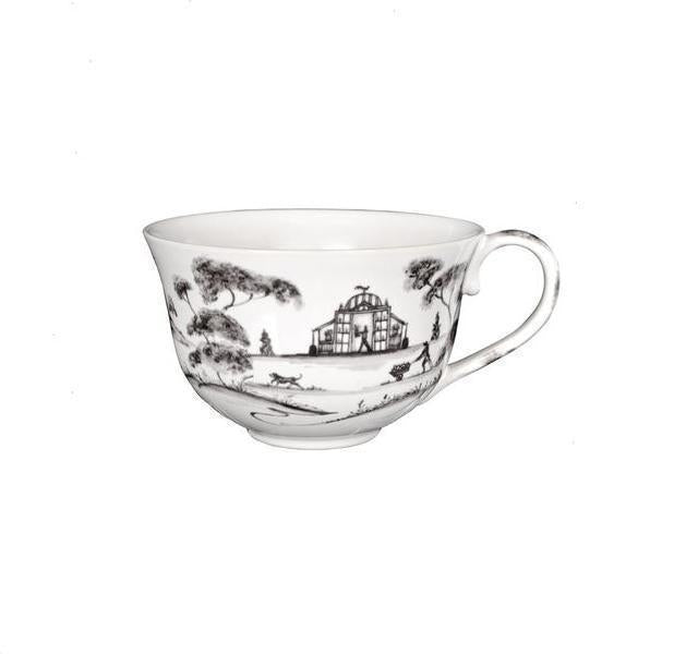 Juliska flint brown tea/coffee cup from the Country Estate Collection, this cup depicts a tranquil scene of the Estates Garden. Other pieces in the five piece place setting depict scenes from the Estates main house, stables, and conservatory. Made in Portugal and is microwave, dishwasher, oven, and freezer safe.