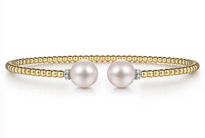 GABRIEL & CO 14KY BUJUKAN 8.5MM FRESH WATER CULTURED PEARL WITH DIAMONDS SPLIT BANGLE BRACELET , DIA=.05CTW, GH/SI, SIZE 6.25