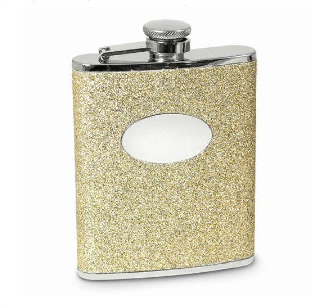 Stainless steel gold glitter 6 Oz. flask with an engravable plate.
