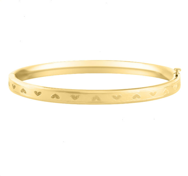 14k yellow gold hinged baby bangle bracelet hand engraved with hearts.