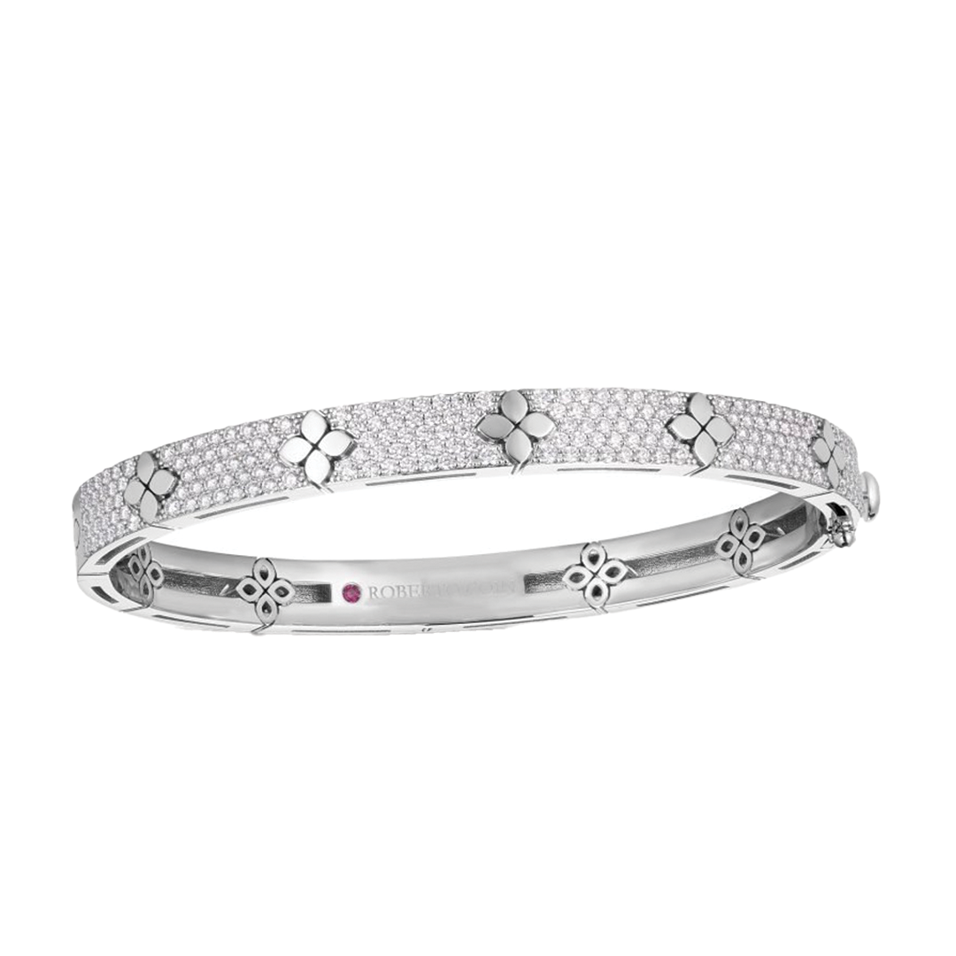 'Love in Verona' Pave Diamond and Polished Flower Bangle in 18K White Gold