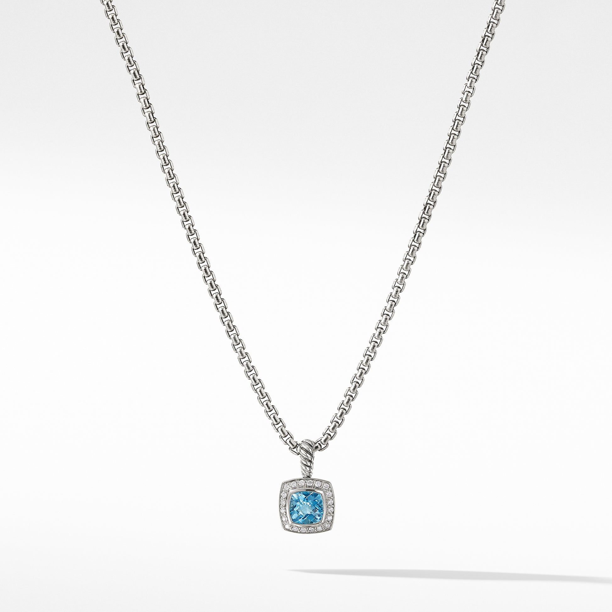 Sterling silver • Faceted blue topaz, 7x7mm, Pavé diamonds, 0.17 total carat weight, • Baby box chain, 1.7mm wide • Pendant, 11x11mm • Lobster clasp-