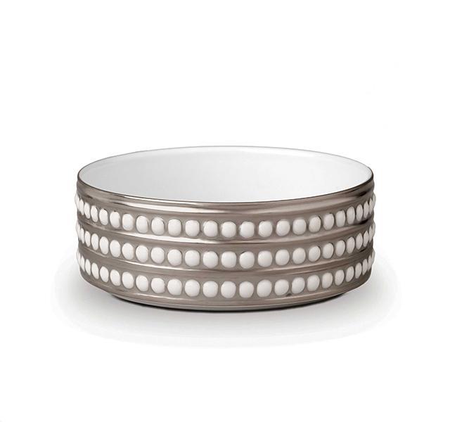 L'Objet Perlée platinum deep bowl. Inspired by the enduring modernity and timeless elegance of the pearl, Perlée is an expression of classic dinnerware. The collection is made of limoges porcelain with meticulously hand-painted details in platinum that highlight the individual pearls.
