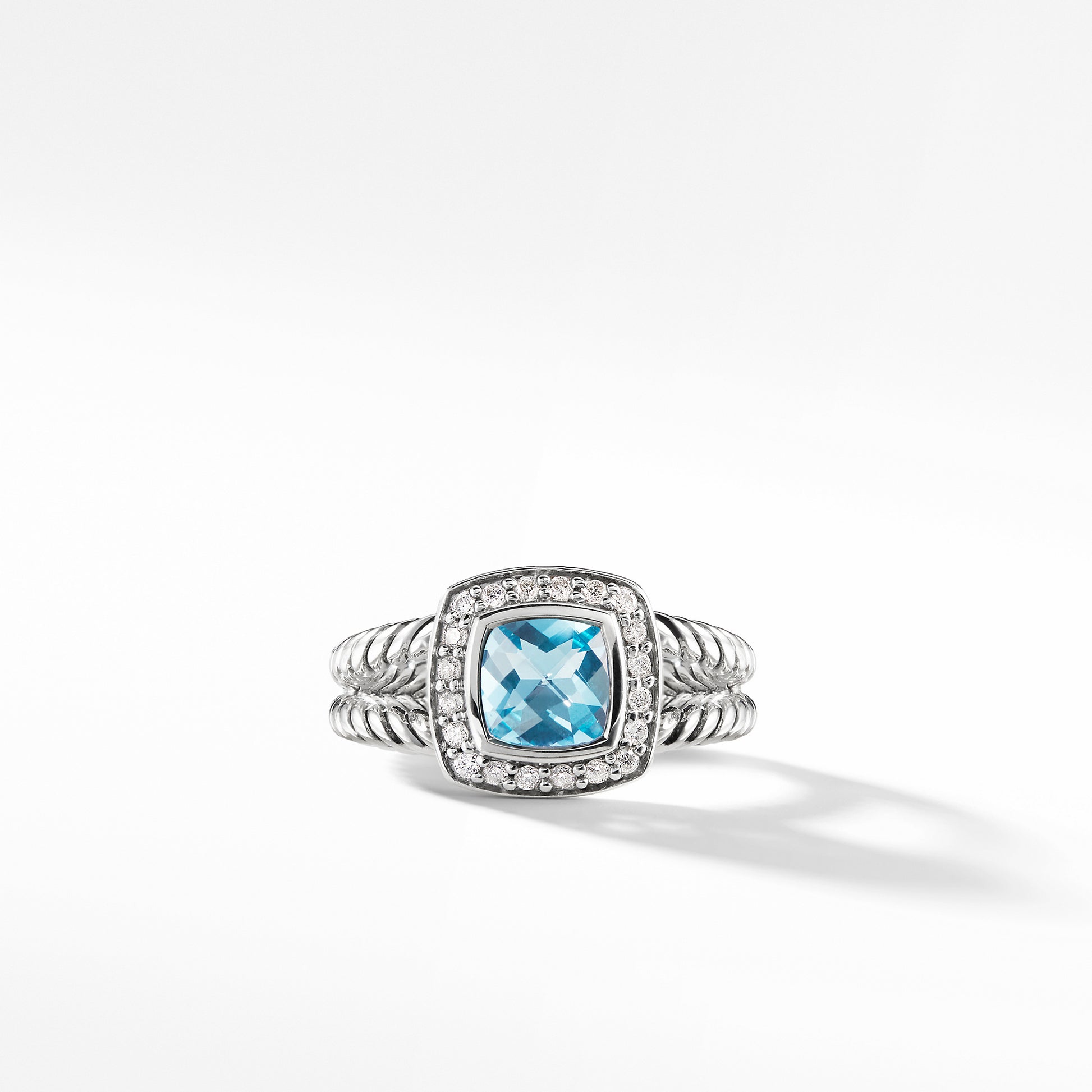 Sterling silver • Faceted blue topaz, 7 x 7mm • Pavé diamonds, 0.17 total carat weight • Ring, 12 x 12mm -Split-shank