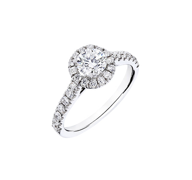 Round brilliant cut diamond halo ring with diamond shank. Ring is in 14k white gold.