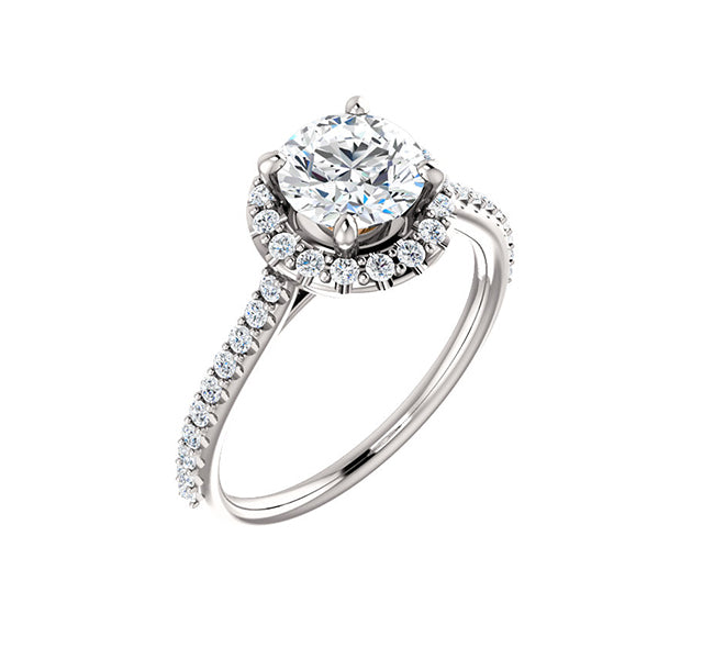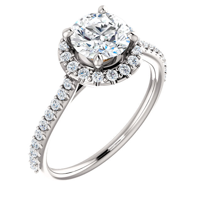 MJ Tried & True Style Halo Setting for 6.5mm Round with a halfway diamond shank and a 14kt. Rose gold under gallery with an infinity symbol. Diamond total weight is 1/3.