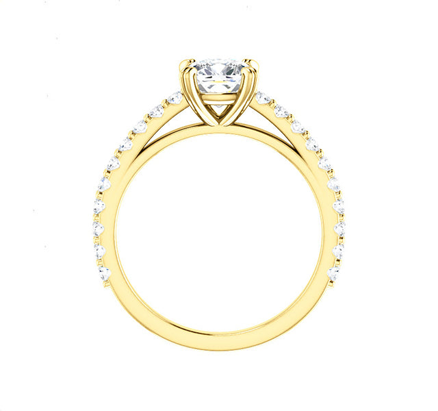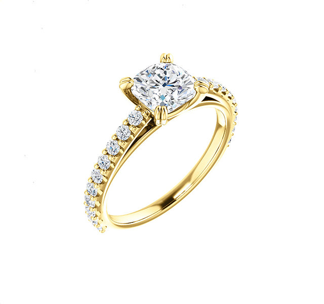 MJ Tried & True setting for 6mm cushion center accented by 3/8 total weight of diamonds set in the shank.