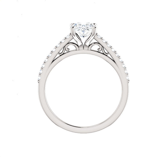 MJ Tried & True setting for oval center accented by .20 total weight of diamonds with scrolled accents in gallery