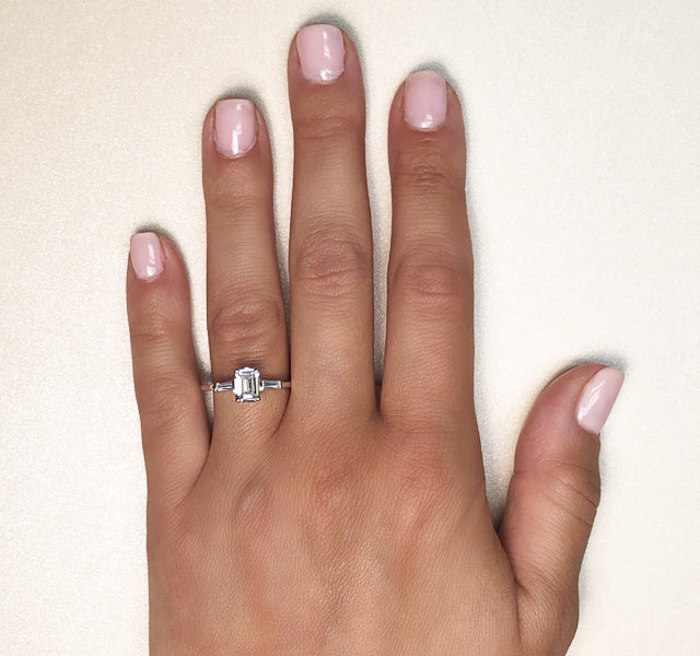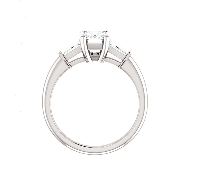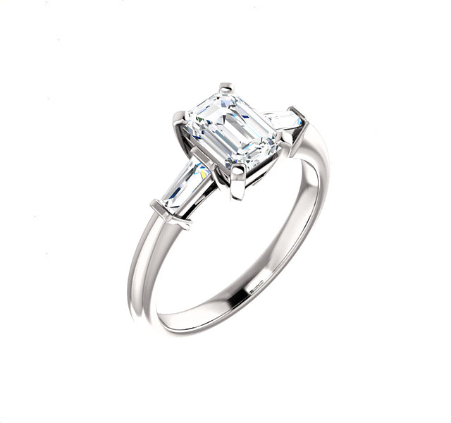 MJ Tried & True high polished three stone mounting for a 7x5mm Emerald Cut diamond and .25 tw diamond baguette sides diamonds.