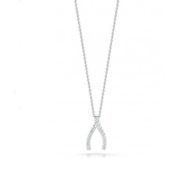 Roberto Coin Tiny Treasures Collection diamond wishbone pendant on 16-18" chain. Tiny Treasures is a collection of whimsical 18k gold and diamond pendants. There is a piece for every personality. D=.12ctw