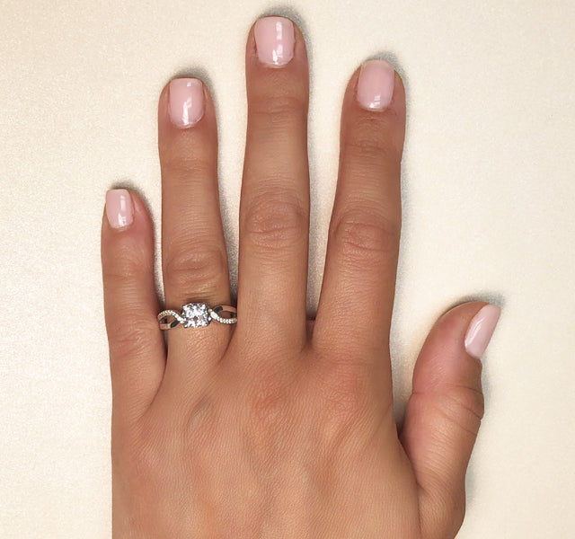 MJ Tried & True Twisted Setting for 6mm Cushion Center Center with polished and bead set diamond accents(.08ct. total weight)