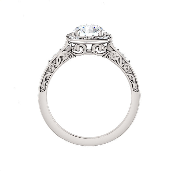 MJ Tried & True Vintage Style for 6.5mm Round Center with Engraved Halo and Shank accented by bead set diamonds.