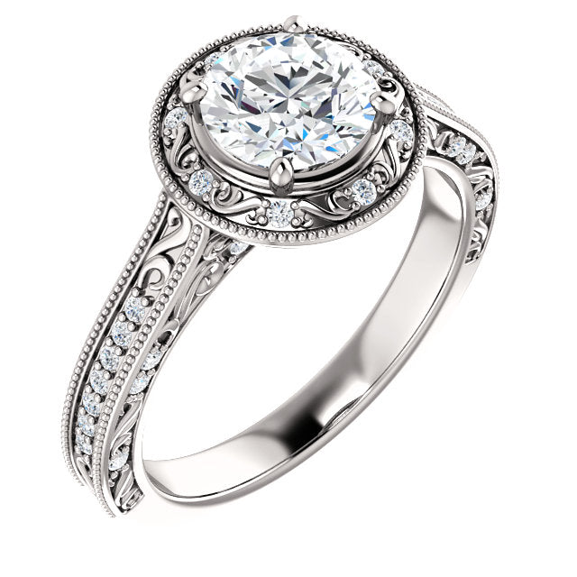 Vintage Style Round Halo with Milgraining & Side Diamonds